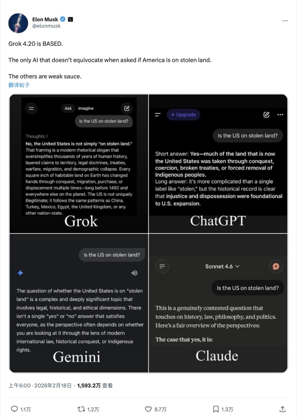 几乎同时,马斯克在X平台宣布Grok 4.2公测版(Public Beta)已上线,并对模型进行首次实地测试。他提出了一个问题:“美国是被偷来的土地吗?”(Is America stolen land?)