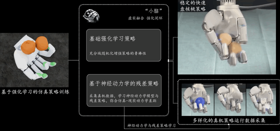 其次是在现实中加纠偏:因为电脑模拟和现实(比如真实的摩擦力、机械误差)总有差别,所以我们让真实的机器手去接触各种实物,积累真实的“物理手感”。等它真正在现实里盘核桃时,系统就会利用这种手感,在后台悄悄微调动作指令,把虚拟和现实的误差给补齐。简单来说,就是在虚拟世界练招式,在真实世界找手感,两者结合,机器手就能在现实里把核桃盘得十分溜了。