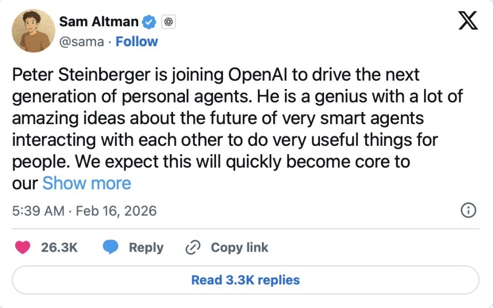 北京时间2月16日,OpenAI首席执行官山姆·奥特曼(Sam Altman)在社交平台X上宣布,开源智能体项目OpenClaw