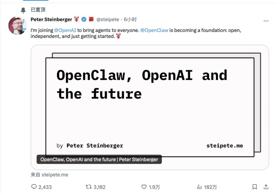 创始人(Peter Steinberger)将正式加入OpenAI,负责推动“下一代