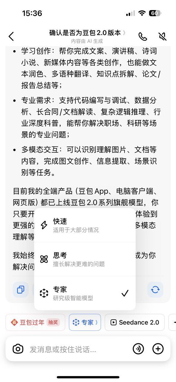 目前,豆包2.0 Pro已在豆包App、电脑客户端和网页版上线,选择「专家」模式即可对话体验。