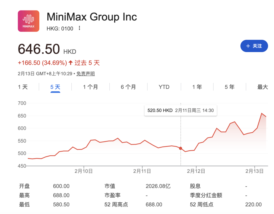 与之相比,本次Minimax M2.5发布相对较为低调。但股价在过去五天之间亦有34.69%的涨幅。