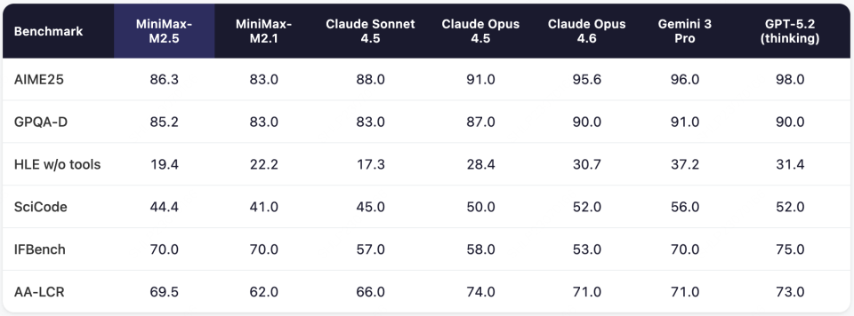 根据输出价格计算,M2.5的成本是Opus、Gemini 3 Pro和GPT-5的十分之一到二十分之一。以100 tokens/秒的速率连续运行一小时M2.5的成本仅为1美元;以50 TPS的速率运行,成本降至0.3美元。换言之,用户可以以每年10,000美元的价格让四个M2.5实例全年不间断运行。