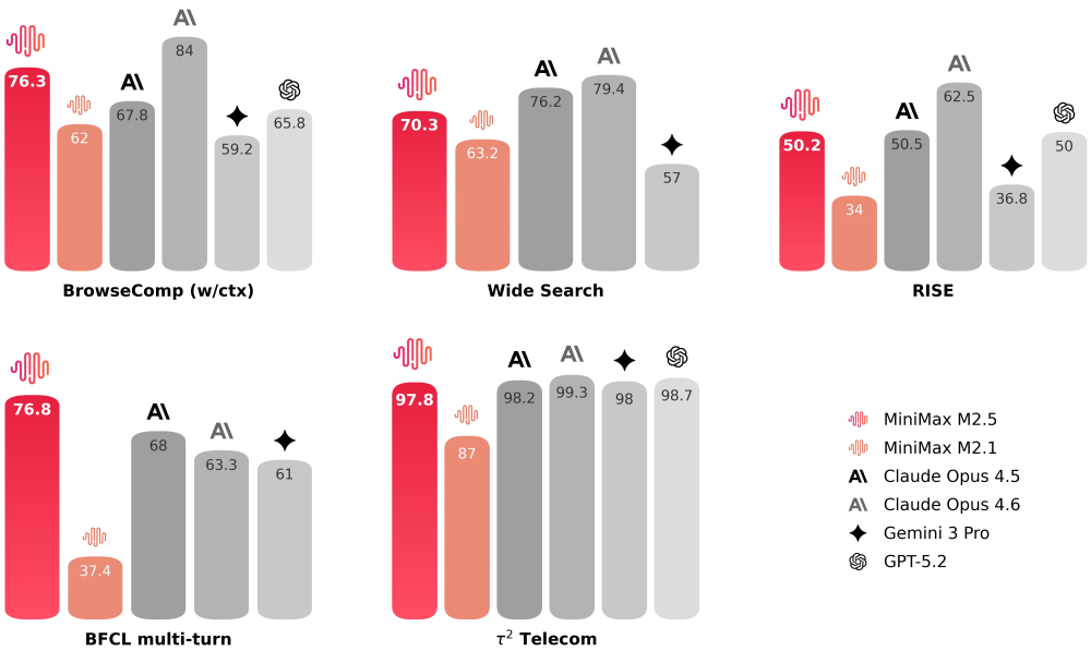 在智能体任务决策方面,M2.5展现出更优的问题解决能力:它学会了用更精准的搜索轮次和更高的token效率来解决问题。例如,在BrowseComp、Wide Search和RISE等多个智能体任务中,M2.5以更少的轮次实现了更好的结果,相比M2.1节省了约20%的搜索轮次。这表明模型不仅能够获得正确答案,还能通过更高效的推理路径达成目标。