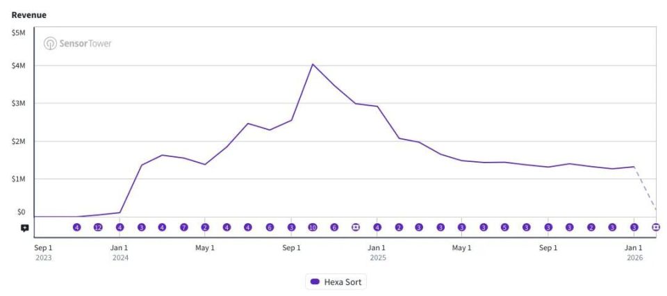 《Hexa Sort》的IAP月收入巅峰时超过400万美元,并在此之后保持着150万/月的量级
